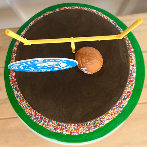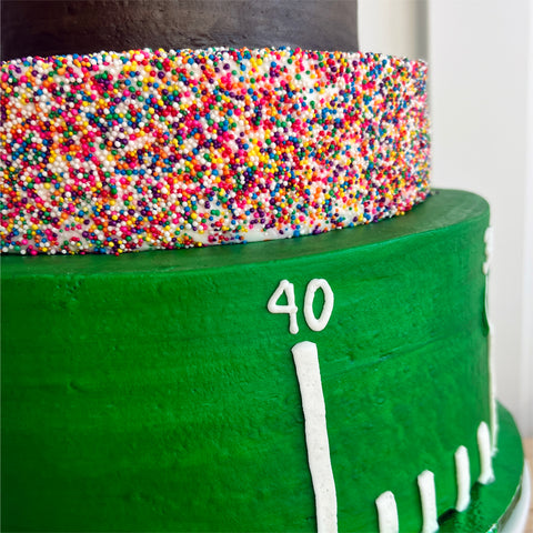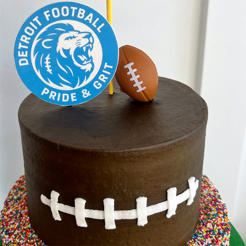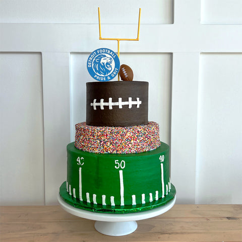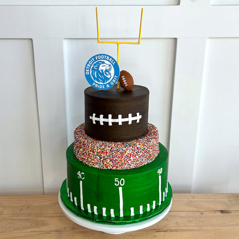 This 3-tier cake will have you cheering. Home Bakery 6" double-round on an 8" single-round on a 10" double-round covered in Home Bakery buttercream. The center tier is covered in multicolor nonpareils. The top is complete with goal post, football, and marshmallow coating Detroit Lions plaque. Choose either white or chocolate cake.